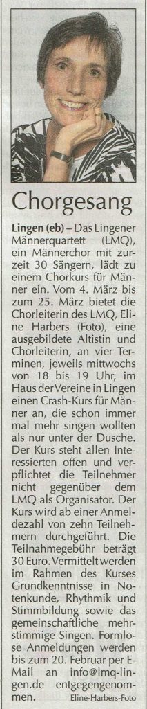 Nein, Sie haben sich nicht verzählt! In der Tat gründete sich das Lingener Männerquartett e.V. im Jahre 1952 als Doppelquartett. Im Laufe der Jahre wuchs der Chor auf zurzeit 29 aktive Sänger an – der Gründungsname blieb.