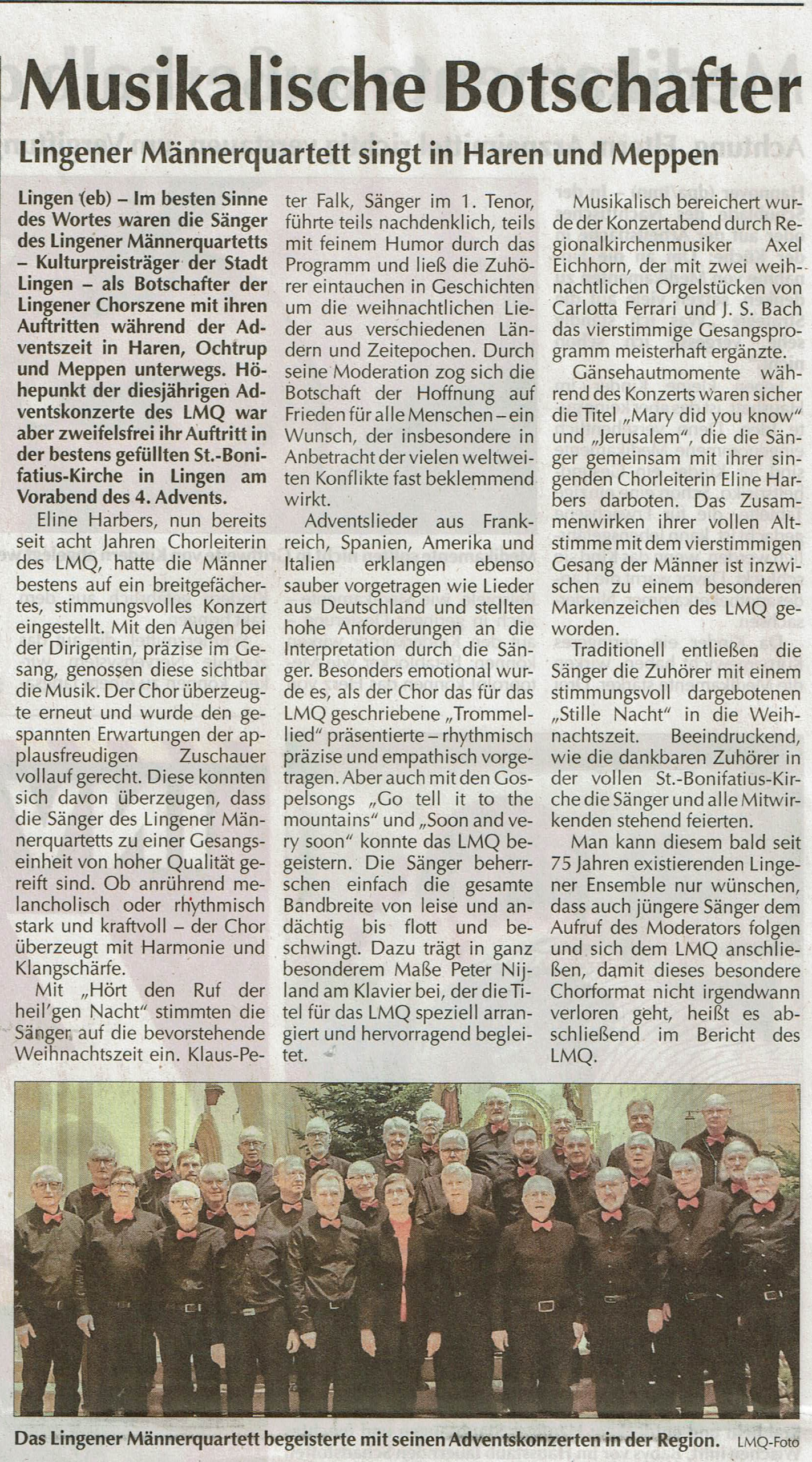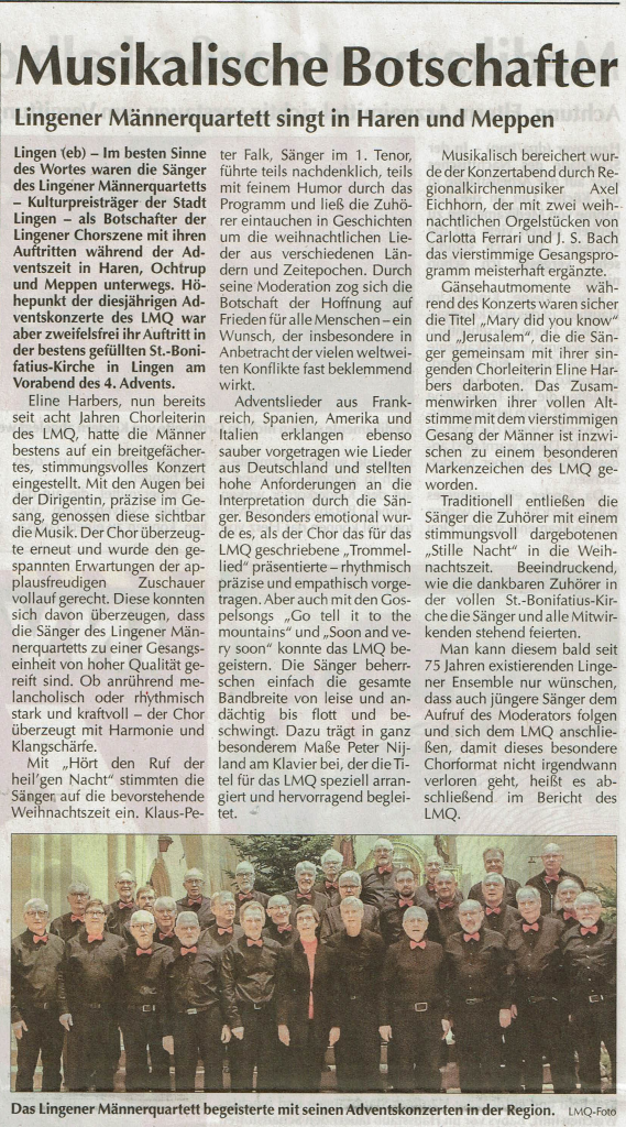 LINGEN (eb). Im besten Sinne des Wortes waren die Sänger des Lingener Männerquartetts – Kulturpreisträger der Stadt Lingen – als Botschafter der Lingener Chorszene mit ihren Auftritten während der Adventszeit in Haren, Ochtrup und Meppen unterwegs. Höhepunkt der diesjährigen Adventskonzerte des LMQ war aber zweifelsfrei ihr Auftritt in der bestens gefüllten St. Bonifatius Kirche in Lingen am Vorabend des 4. Advent.